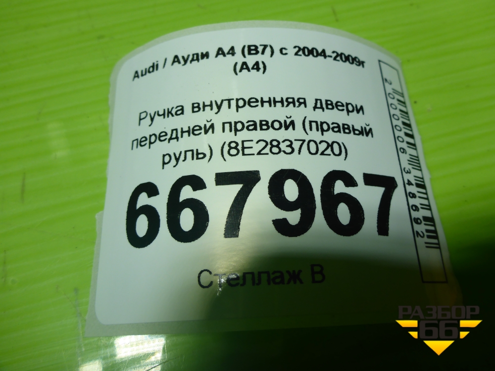 Ручка внутренняя двери передней правой (правый руль) (8E2837020) для Audi A4 (В7) с 2004-2009г (А4) в Перми