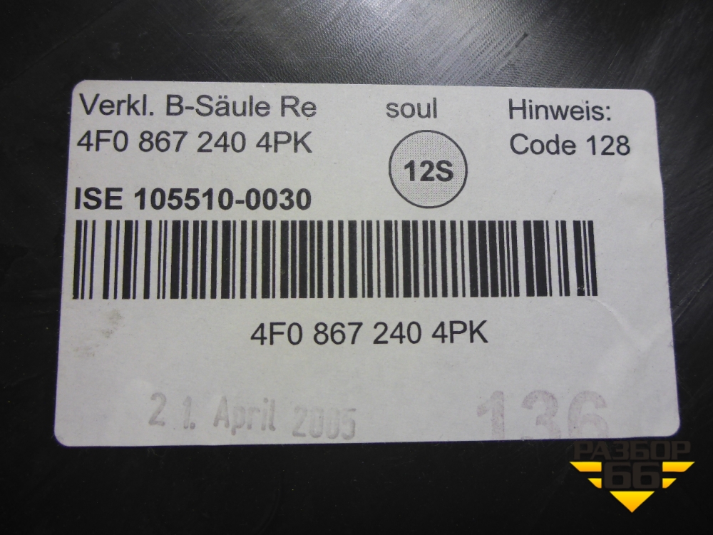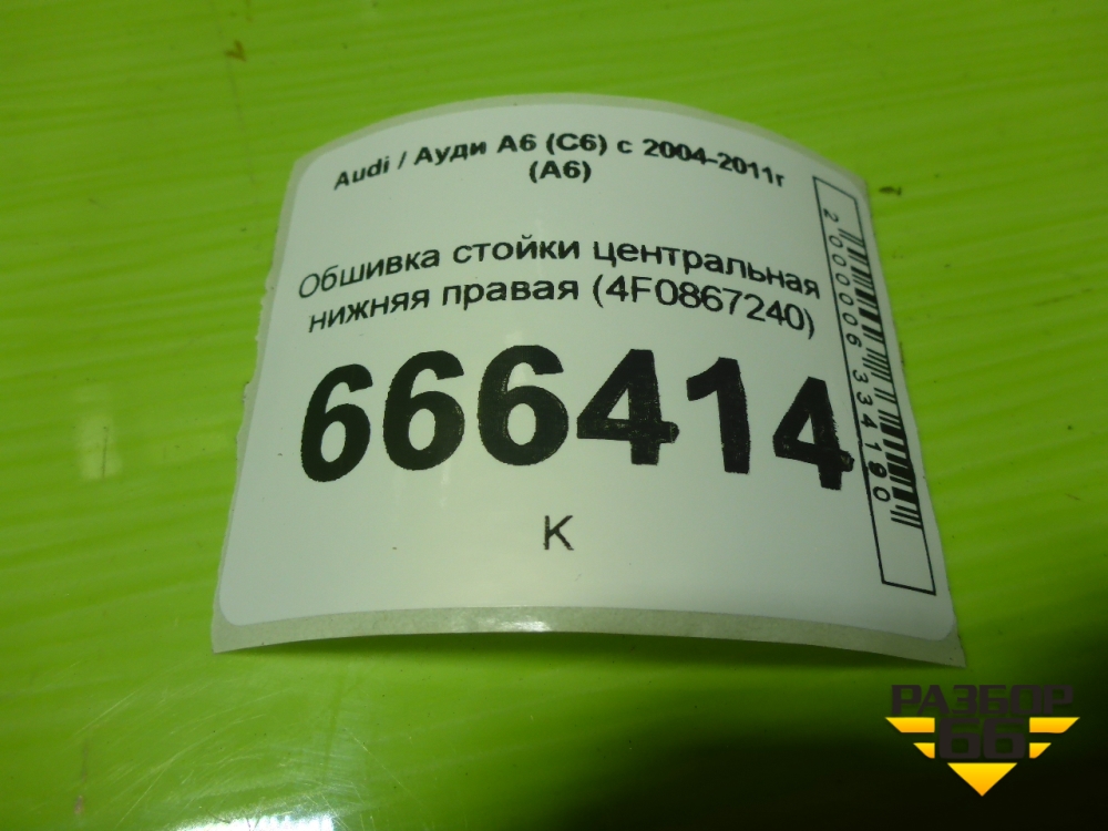 Обшивка стойки центральная нижняя правая (4F0867240) для Audi A6 (C6) с 2004-2011г (А6) в Перми