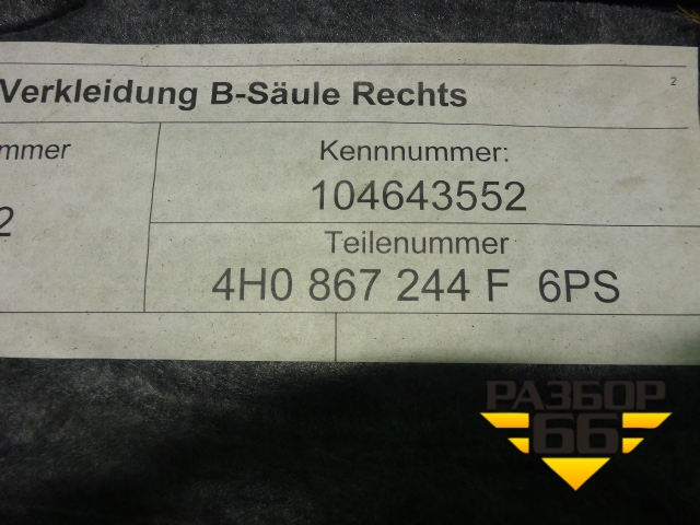Обшивка стойки центральная нижняя правая (4H0867244F6PS) для Audi A8 с 2009-2017г (А8) в Перми