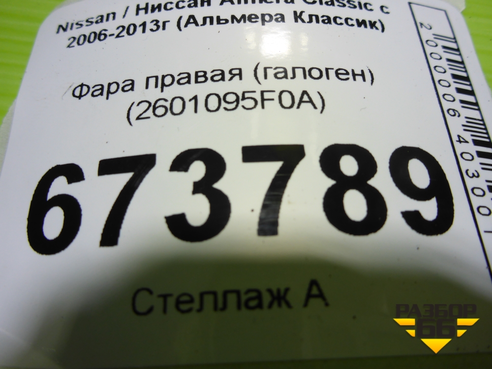 Фара правая (галоген) (2601095F0A) для Nissan Almera Classic с 2006-2013г (Альмера Классик) в Перми