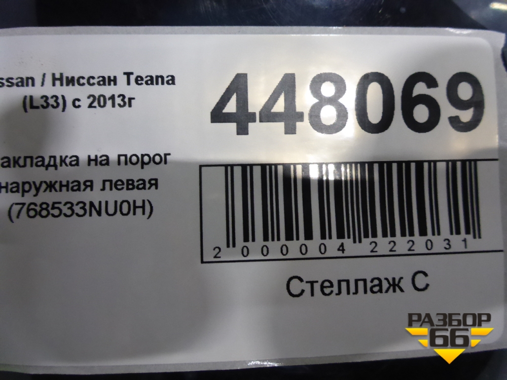 Накладка на порог наружная левая (768533NU0H) для Nissan Teana (L33) с 2013г (Теана) в Перми