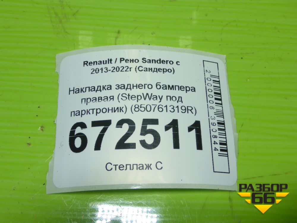 Накладка заднего бампера правая (StepWay под парктроник) (850761319R) для Renault Sandero с 2013-2022г (Сандеро) в Перми