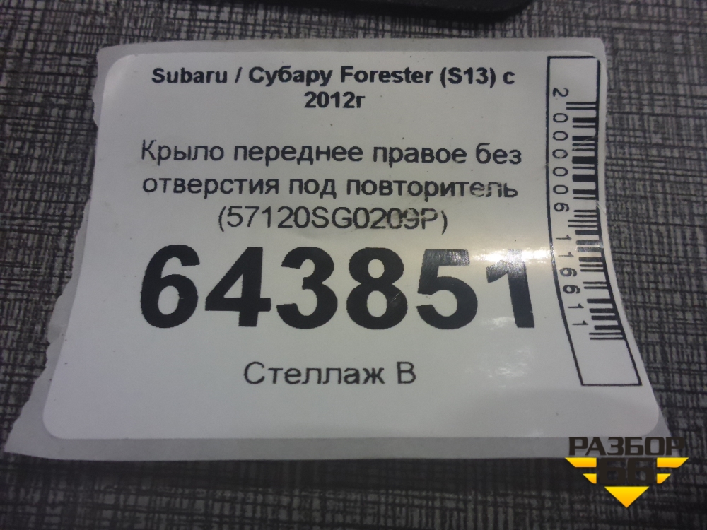 Крыло переднее правое без отверстия под повторитель (57120SG0209P) для Subaru Forester (S13) с 2012г (Форестер) в Перми