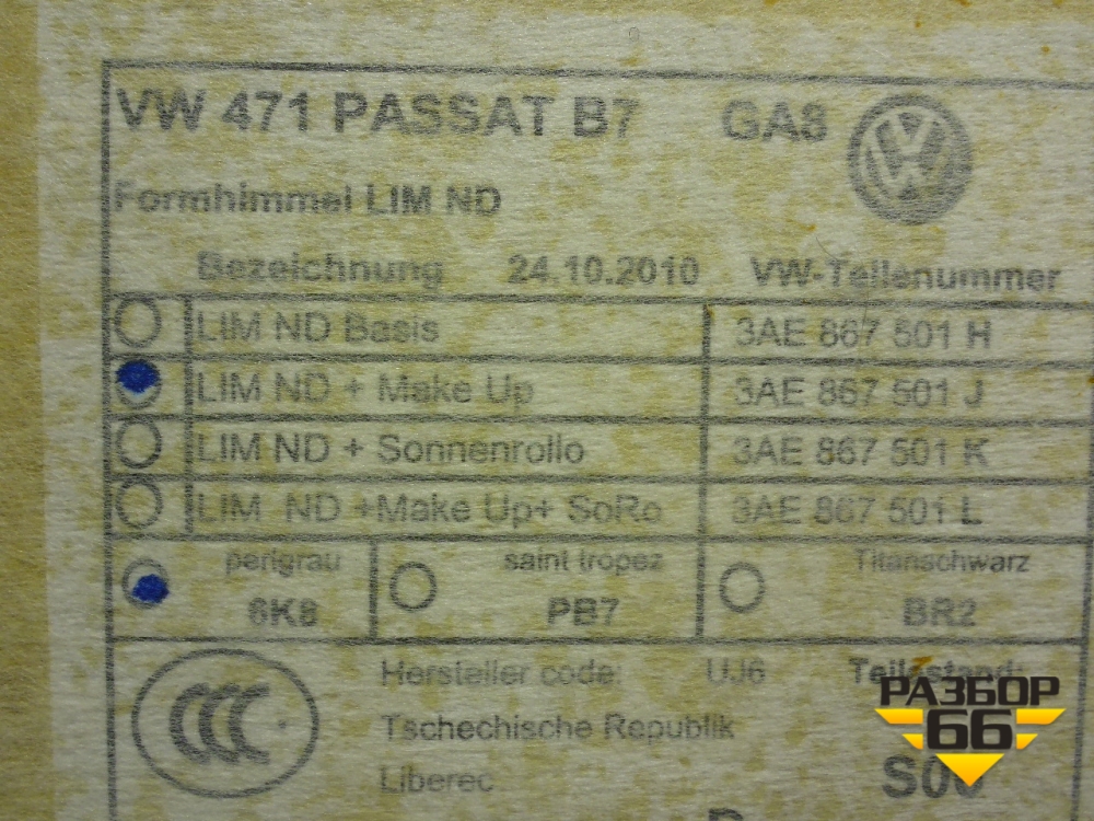 Обшивка потолка (седан) (3AE867501J) для Volkswagen Passat (В7) с 2011-2014г (Пассат Б7) в Перми